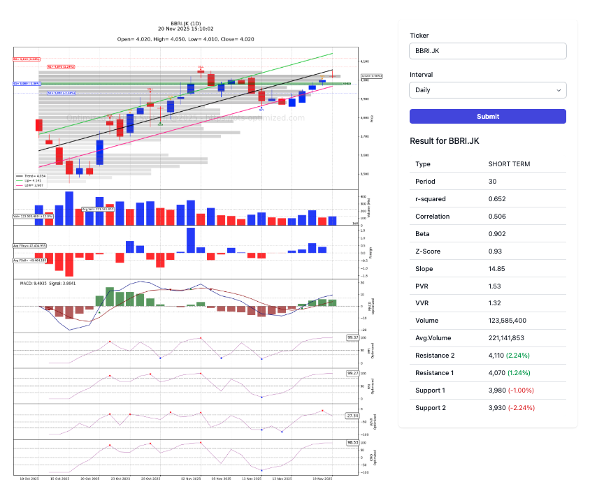 • Rentang Harga (Agus–Nov): secara Analisis Teknikal Saham BBRI bergerak dalam rentang moderat, dengan beberapa lonjakan volume pada berita korporasi/ekonomi; harga harian terlihat berkisar mendekati area support/resistance utama yang juga tercatat di data historis. (lihat arsip harga harian). (Yahoo Finance)